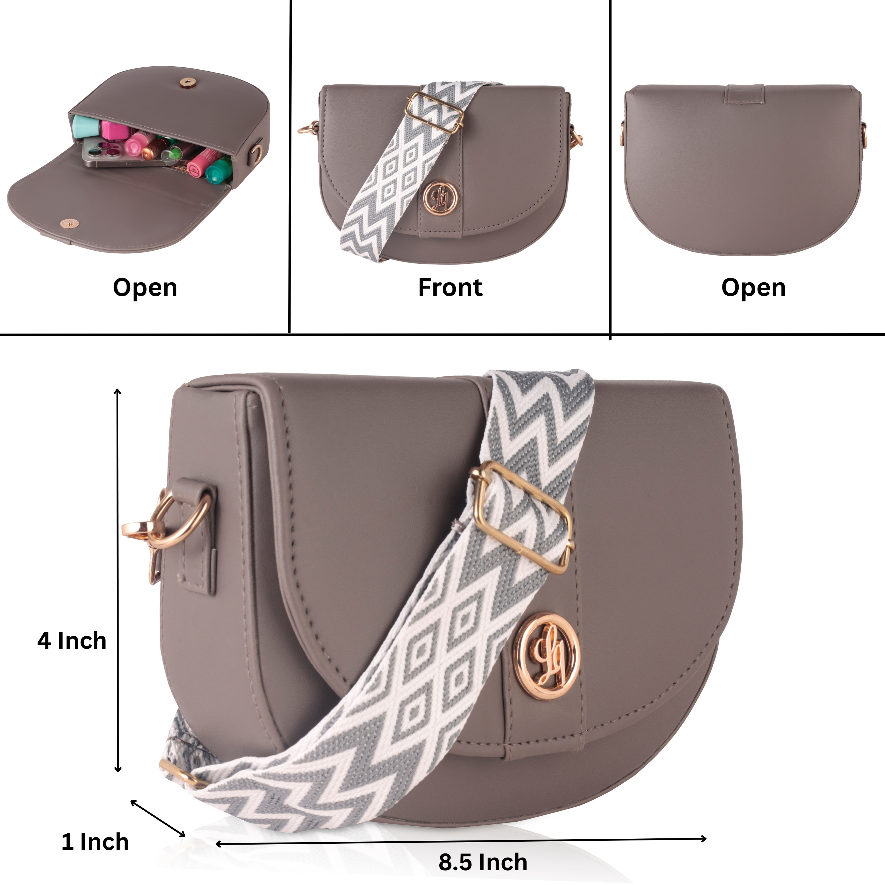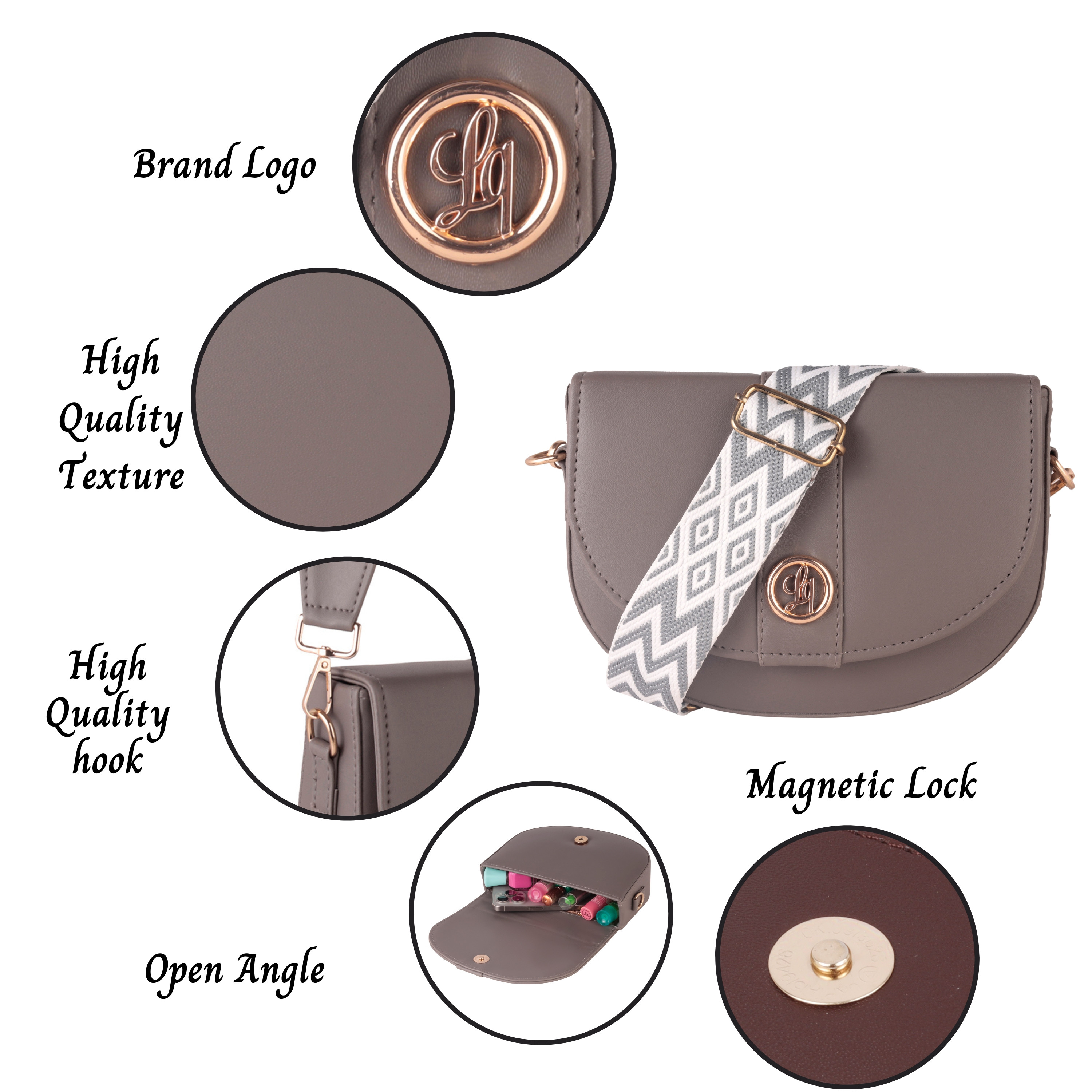 Laqueen Grey Women Sling Bag Cross-Body Bag For Women With Detachable Broad Strap The Laqueen crossbody bag has got the kind of vibes that make you smile every time you wear it. The smooth, high-shine texture and structured silhouette give it a polished edge, while the playful rotatable top handle adds a touch of whimsy. Inside, you’ll find the perfect amount of space for your essentials—one compartment, two card slots, and a zipper pocket to keep things tidy. With its adjustable, detachable wide strap, this bag goes from crossbody to top-handle in a snap. Whether it’s casual, classy, or party-ready, this cutie’s got you covered.