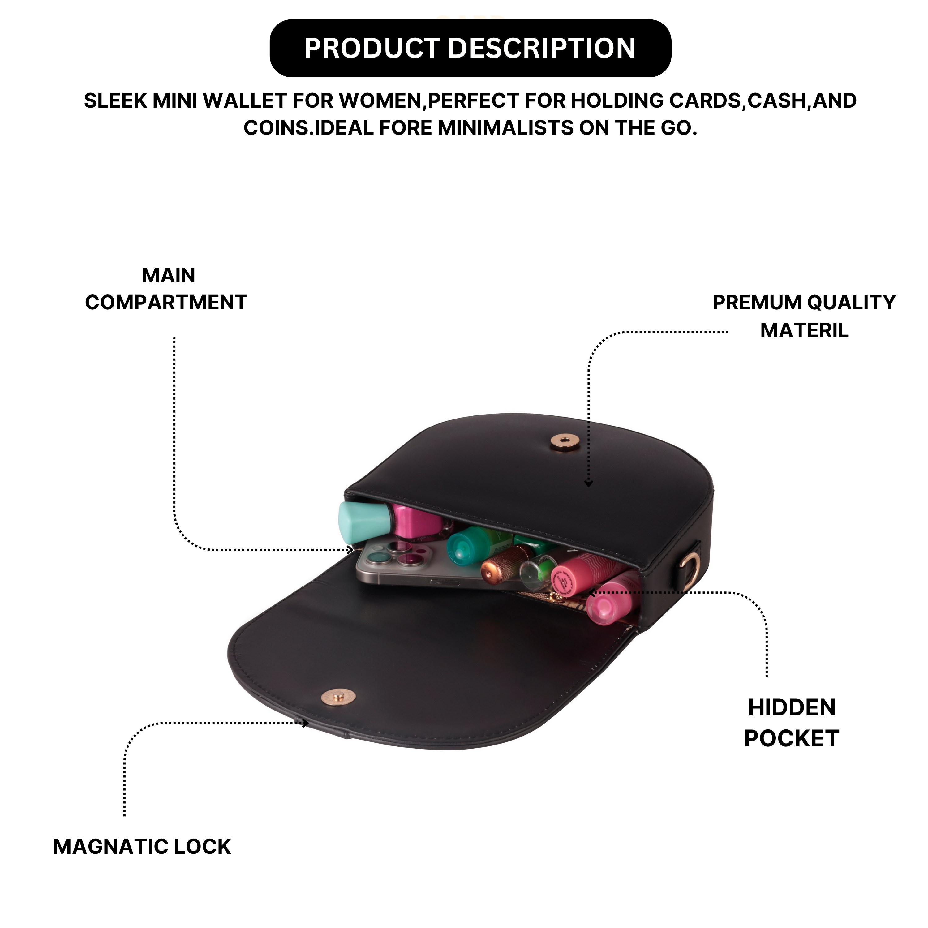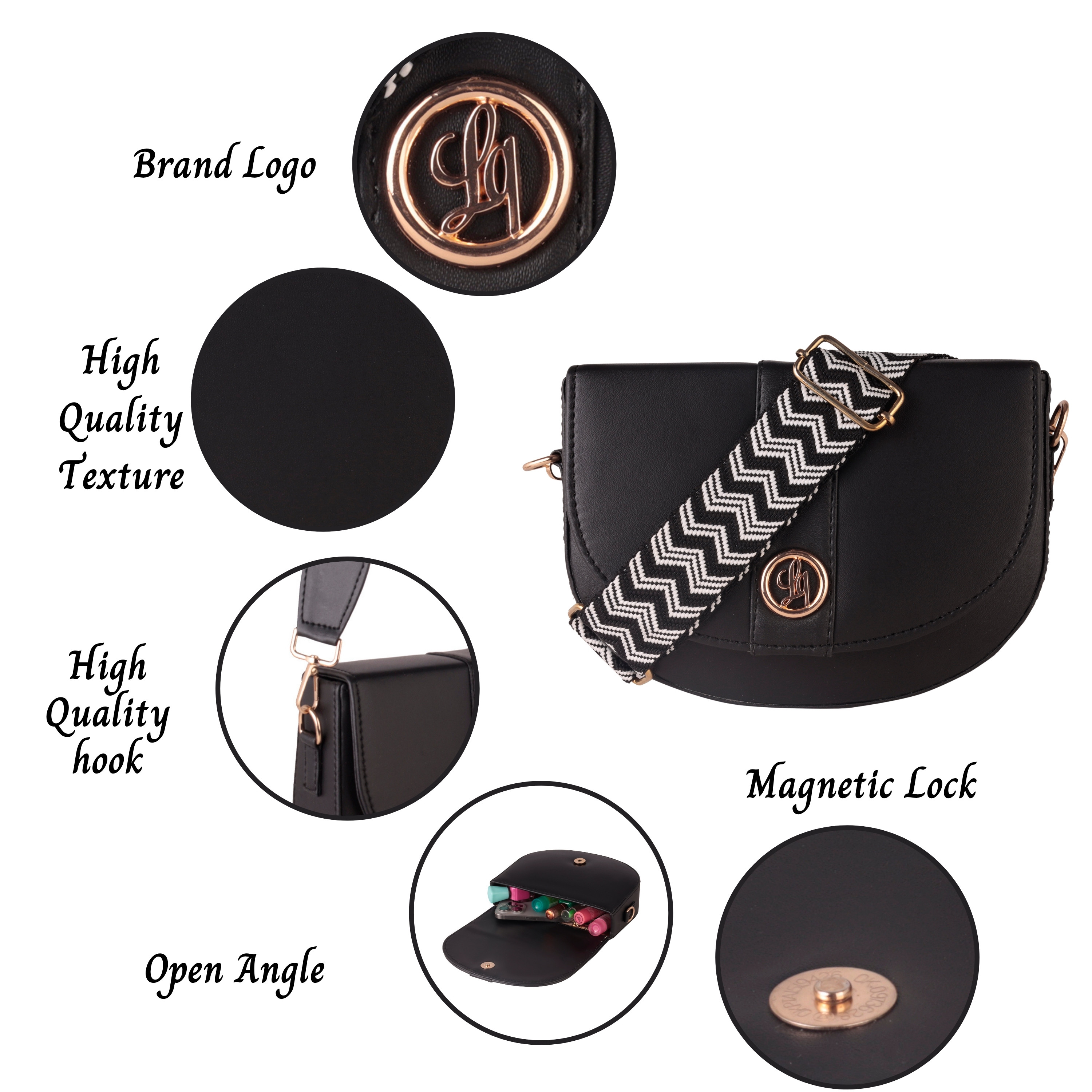 Laqueen Black Women Sling Bag Cross-Body Bag For Women With Detachable Broad Strap The Laqueen crossbody bag has got the kind of vibes that make you smile every time you wear it. The smooth, high-shine texture and structured silhouette give it a polished edge, while the playful rotatable top handle adds a touch of whimsy. Inside, you’ll find the perfect amount of space for your essentials—one compartment, two card slots, and a zipper pocket to keep things tidy. With its adjustable, detachable wide strap, this bag goes from crossbody to top-handle in a snap. Whether it’s casual, classy, or party-ready, this cutie’s got you covered.