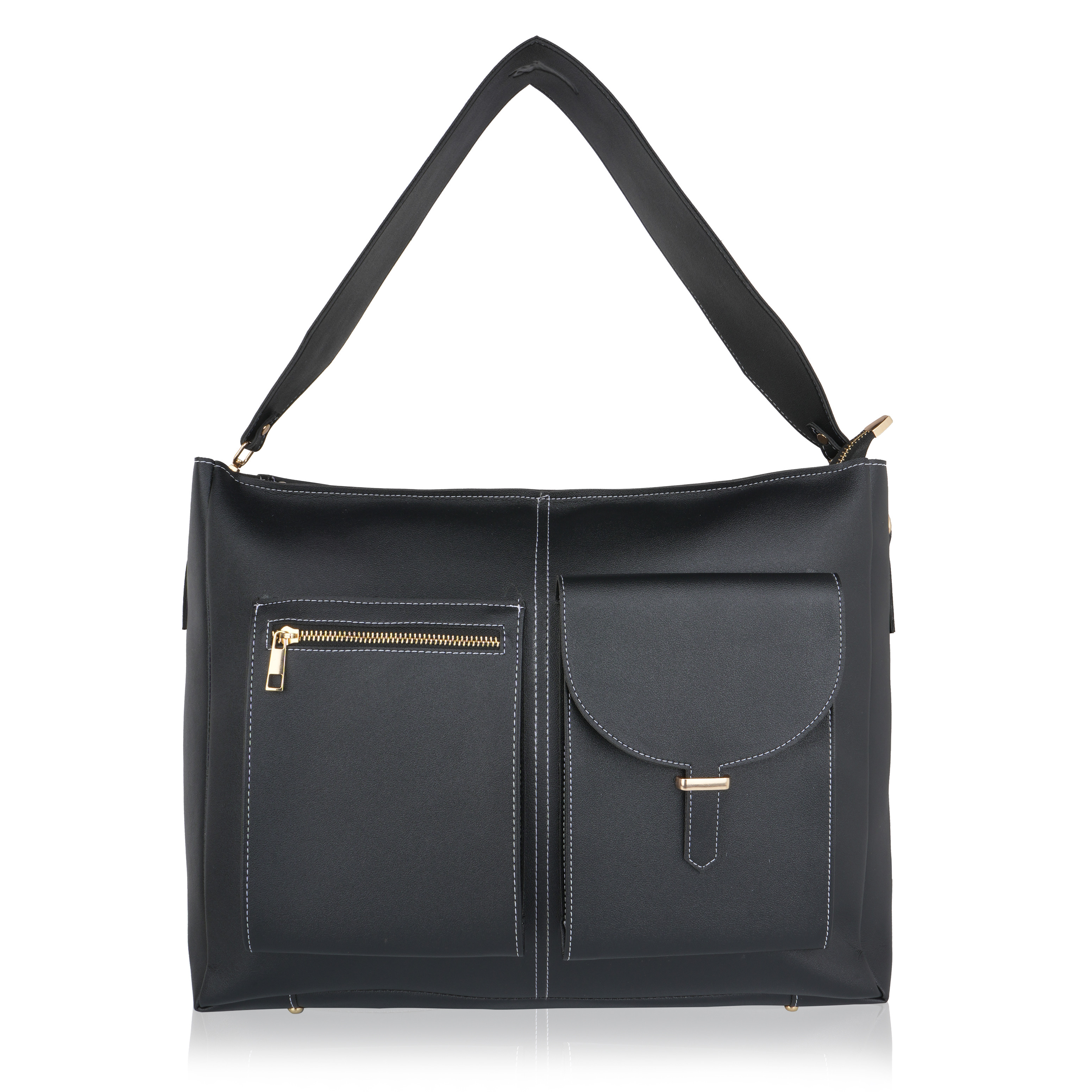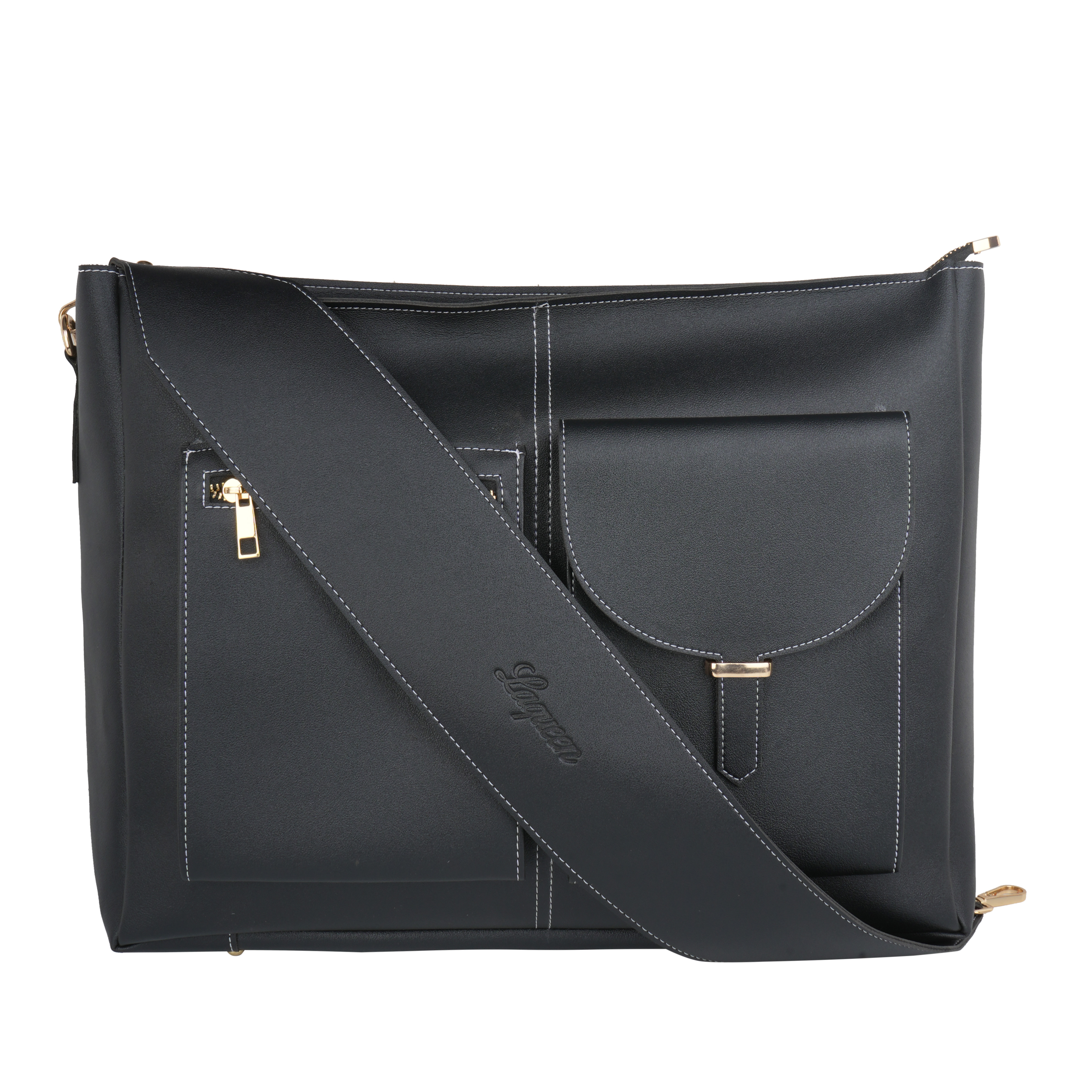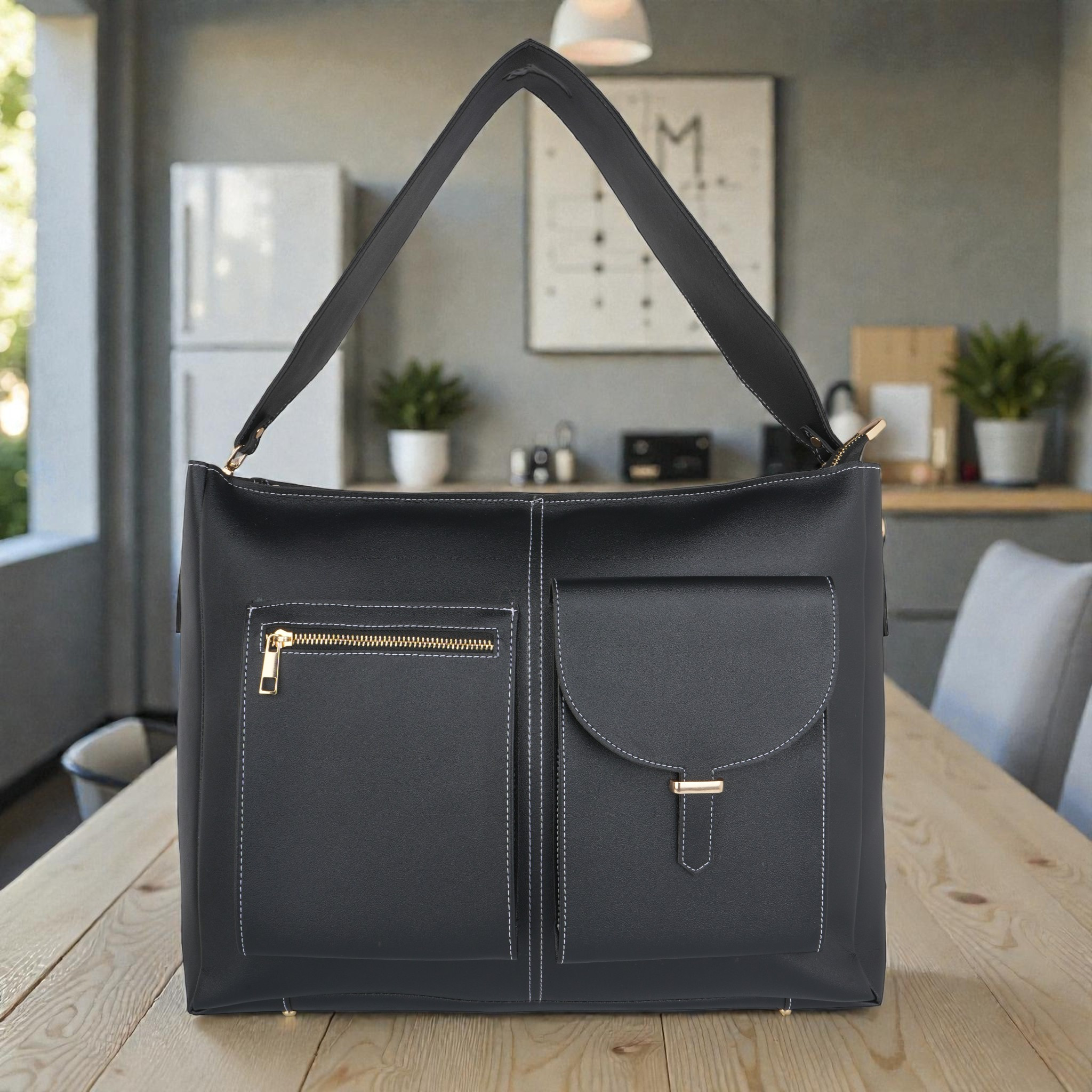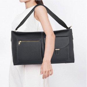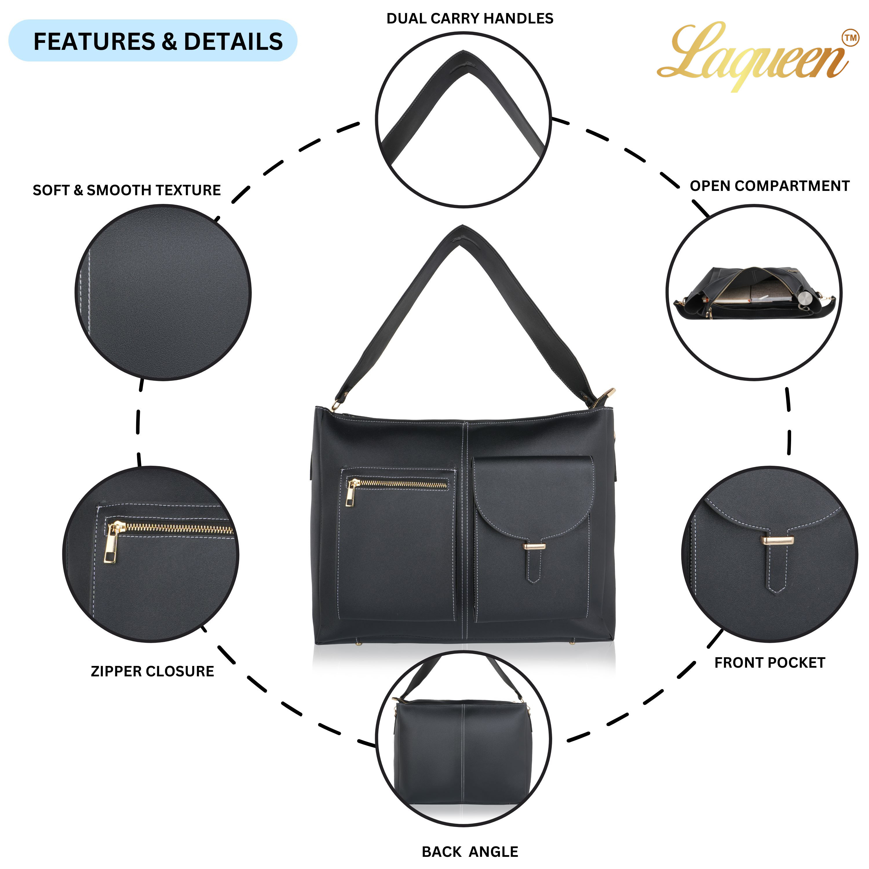 Laqueen Black Women Tote Bag With Front Pockets, Zip Closure And with Detachable Handle Laqueen Tote Bag is sleek and structured tote bag designed for everyday use. Made with a smooth matte finish, it features a secure zip closure and a comfortable shoulder strap for easy carrying. A modern structured tote bag with a front flap pocket and zip closure. Ideal for working ladies, suitable for office, meetings, and daily wear. Crafted for modern working ladies, this tote bag combines a structured look with practical storage, making it perfect for office and everyday use.