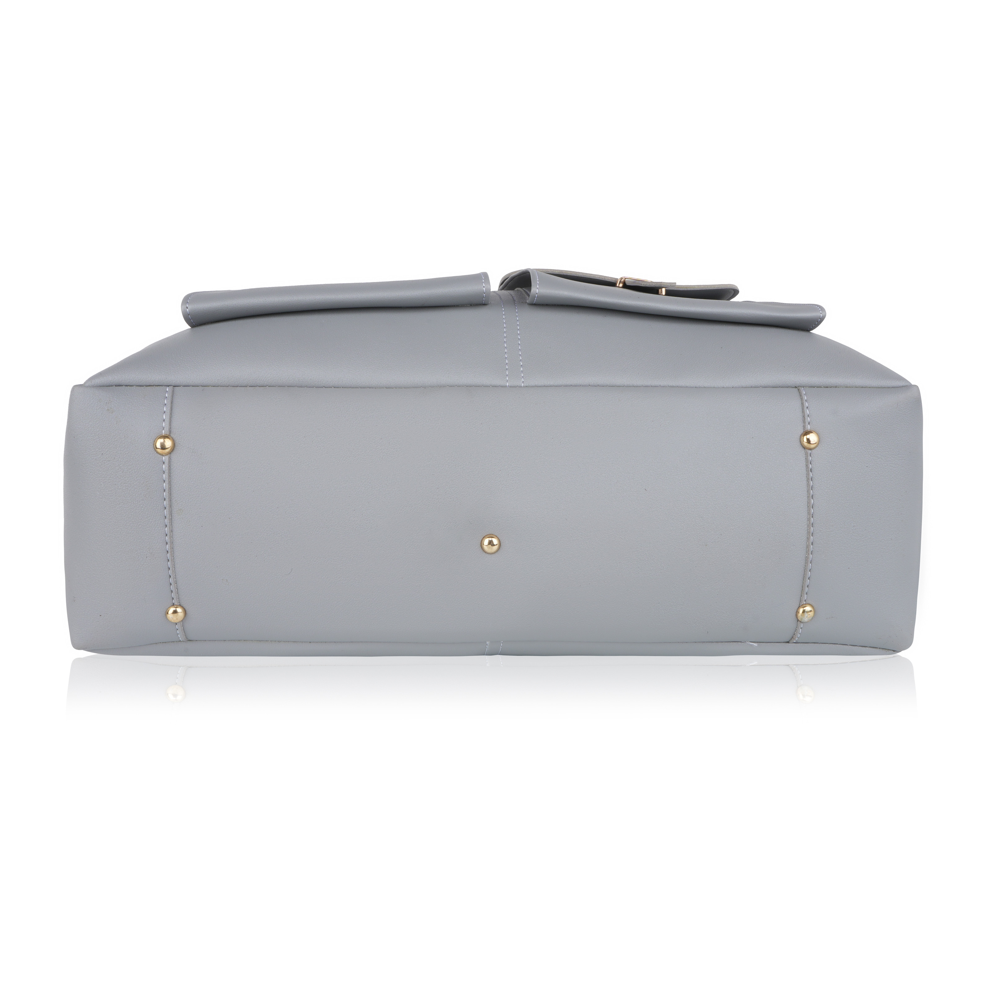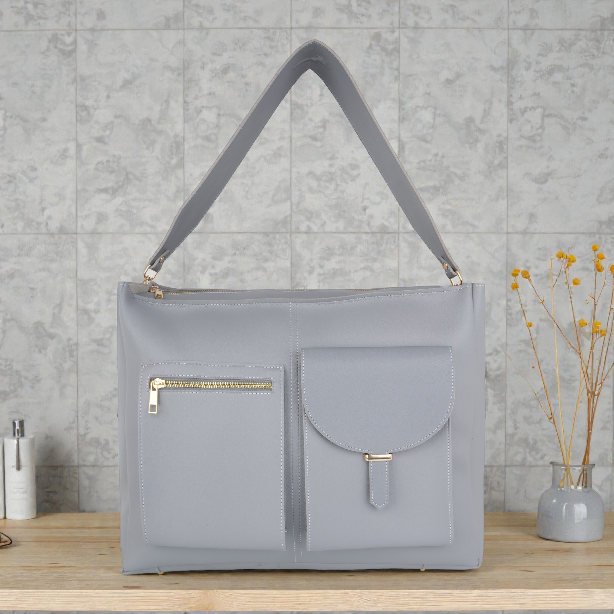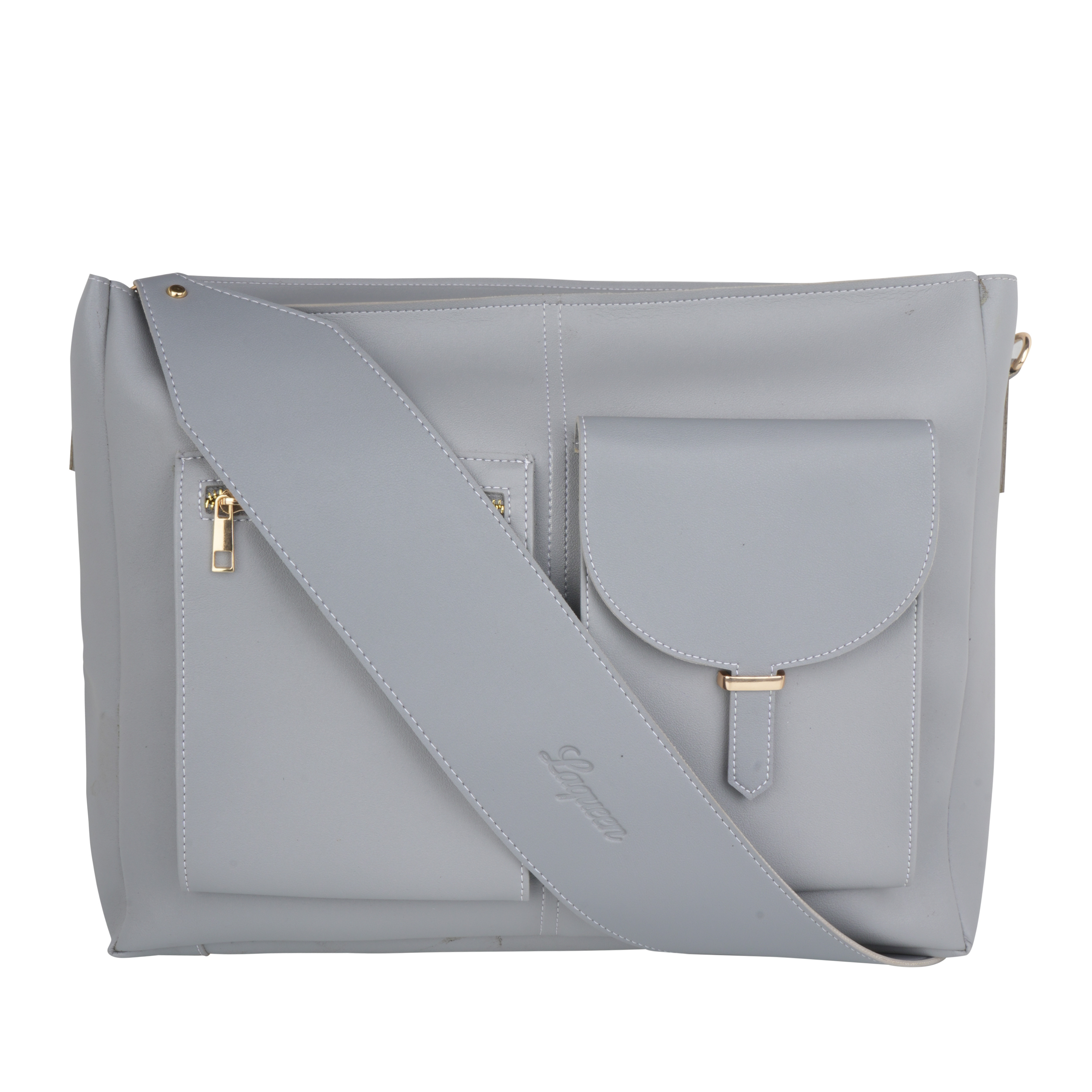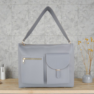 Laqueen Grey Women Tote Bag With Front Pockets, Zip Closure And with Detachable Handle Laqueen Tote Bag is sleek and structured tote bag designed for everyday use. Made with a smooth matte finish, it features a secure zip closure and a comfortable shoulder strap for easy carrying. A modern structured tote bag with a front flap pocket and zip closure. Ideal for working ladies, suitable for office, meetings, and daily wear. Crafted for modern working ladies, this tote bag combines a structured look with practical storage, making it perfect for office and everyday use.