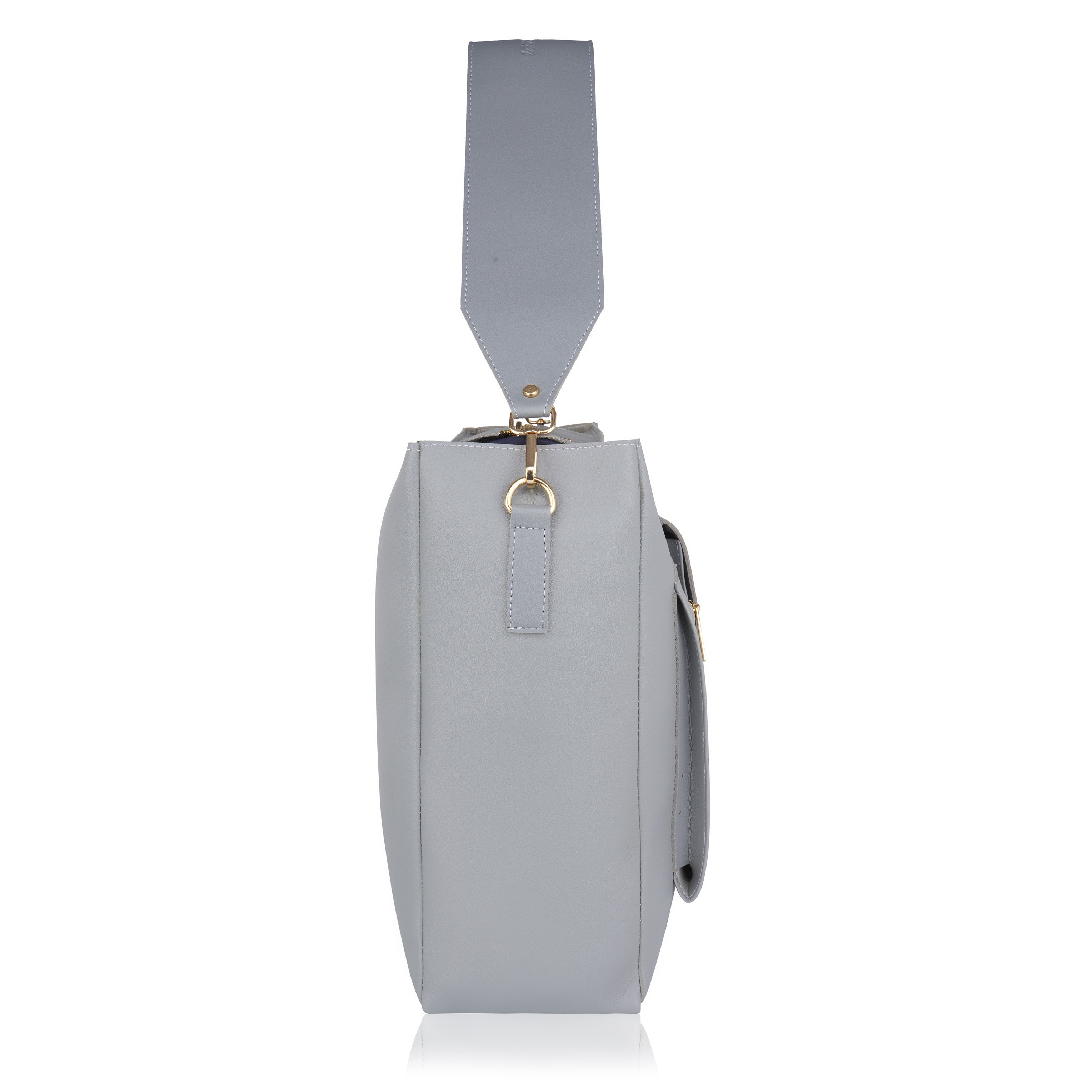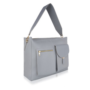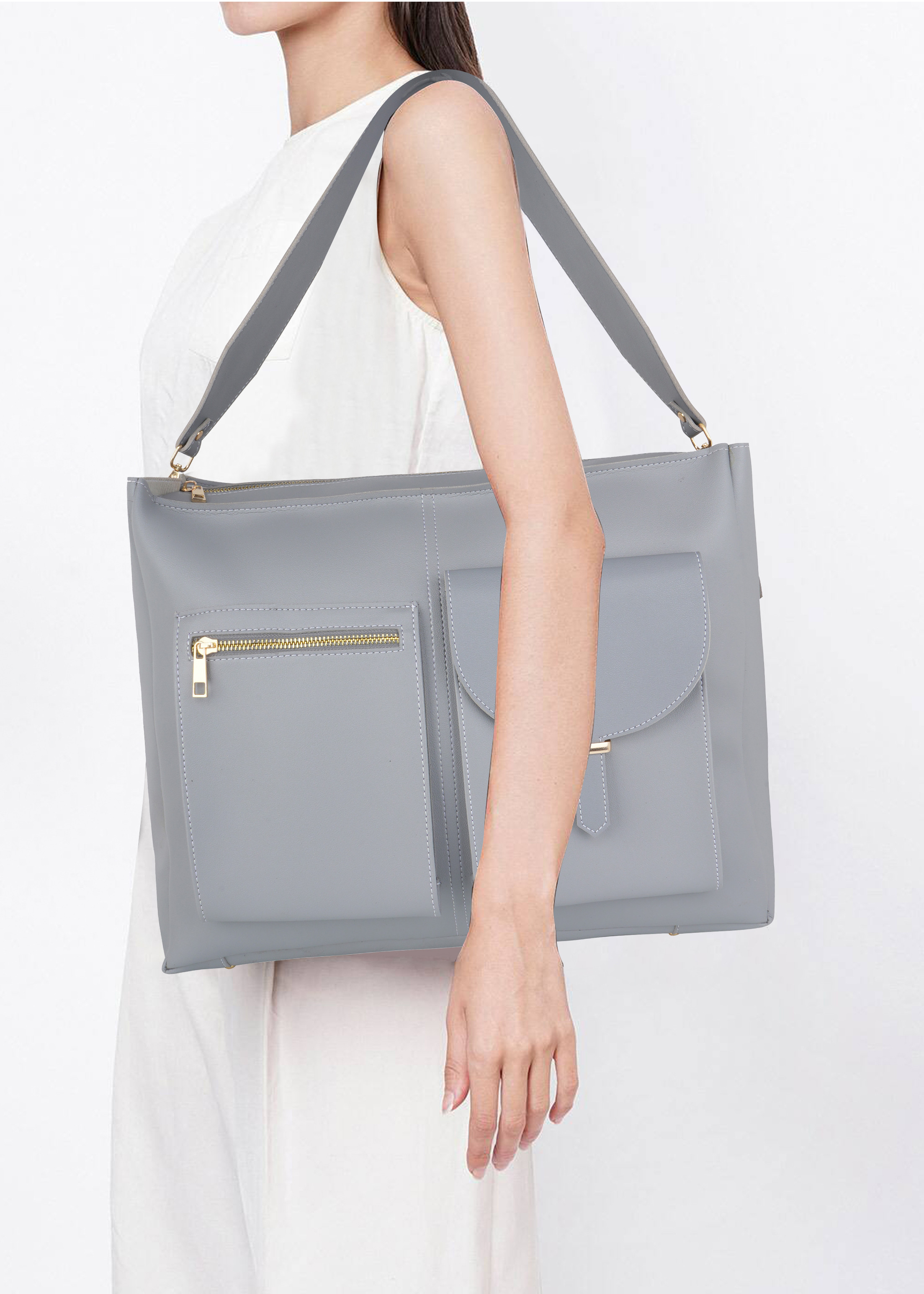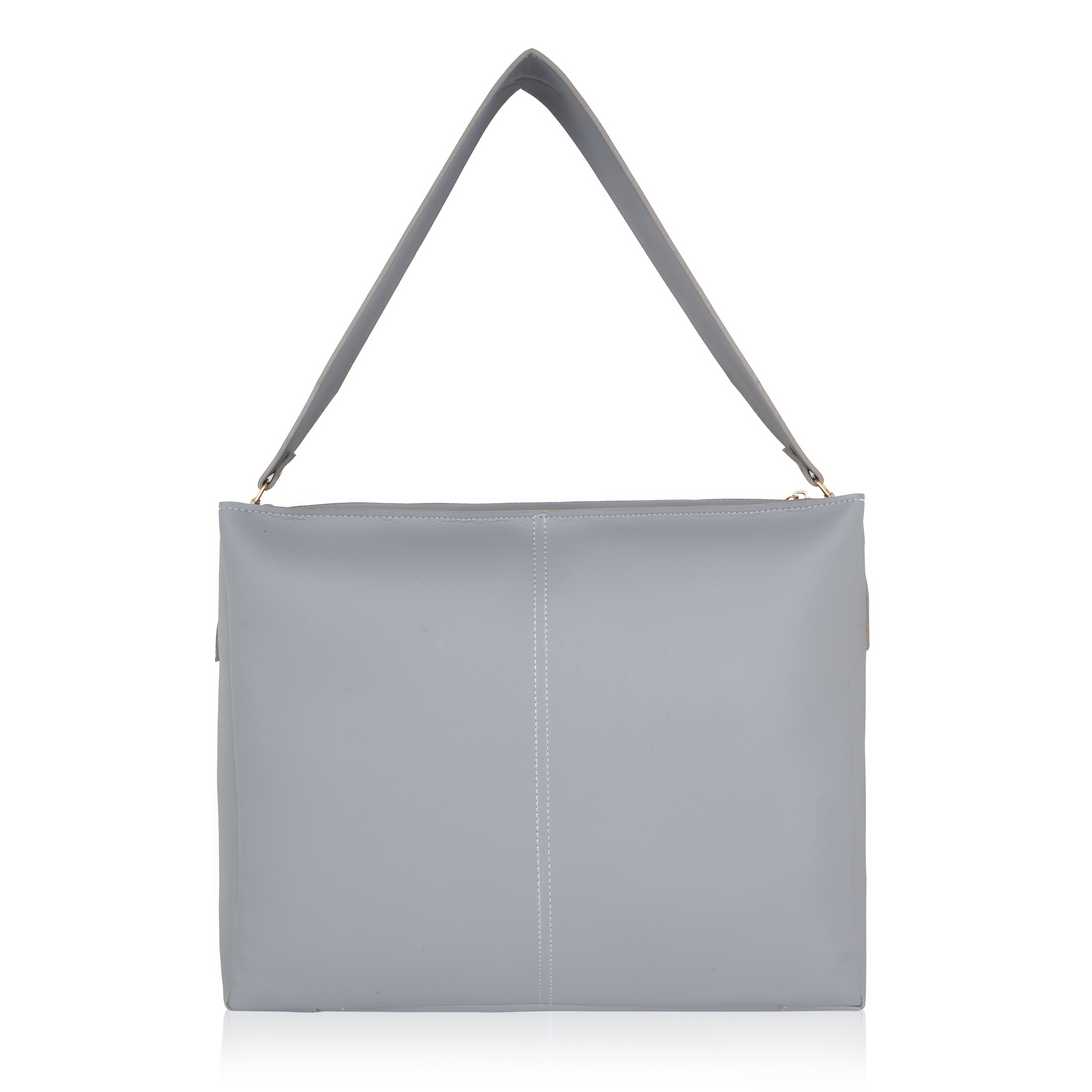 Laqueen Grey Women Tote Bag With Front Pockets, Zip Closure And with Detachable Handle Laqueen Tote Bag is sleek and structured tote bag designed for everyday use. Made with a smooth matte finish, it features a secure zip closure and a comfortable shoulder strap for easy carrying. A modern structured tote bag with a front flap pocket and zip closure. Ideal for working ladies, suitable for office, meetings, and daily wear. Crafted for modern working ladies, this tote bag combines a structured look with practical storage, making it perfect for office and everyday use.