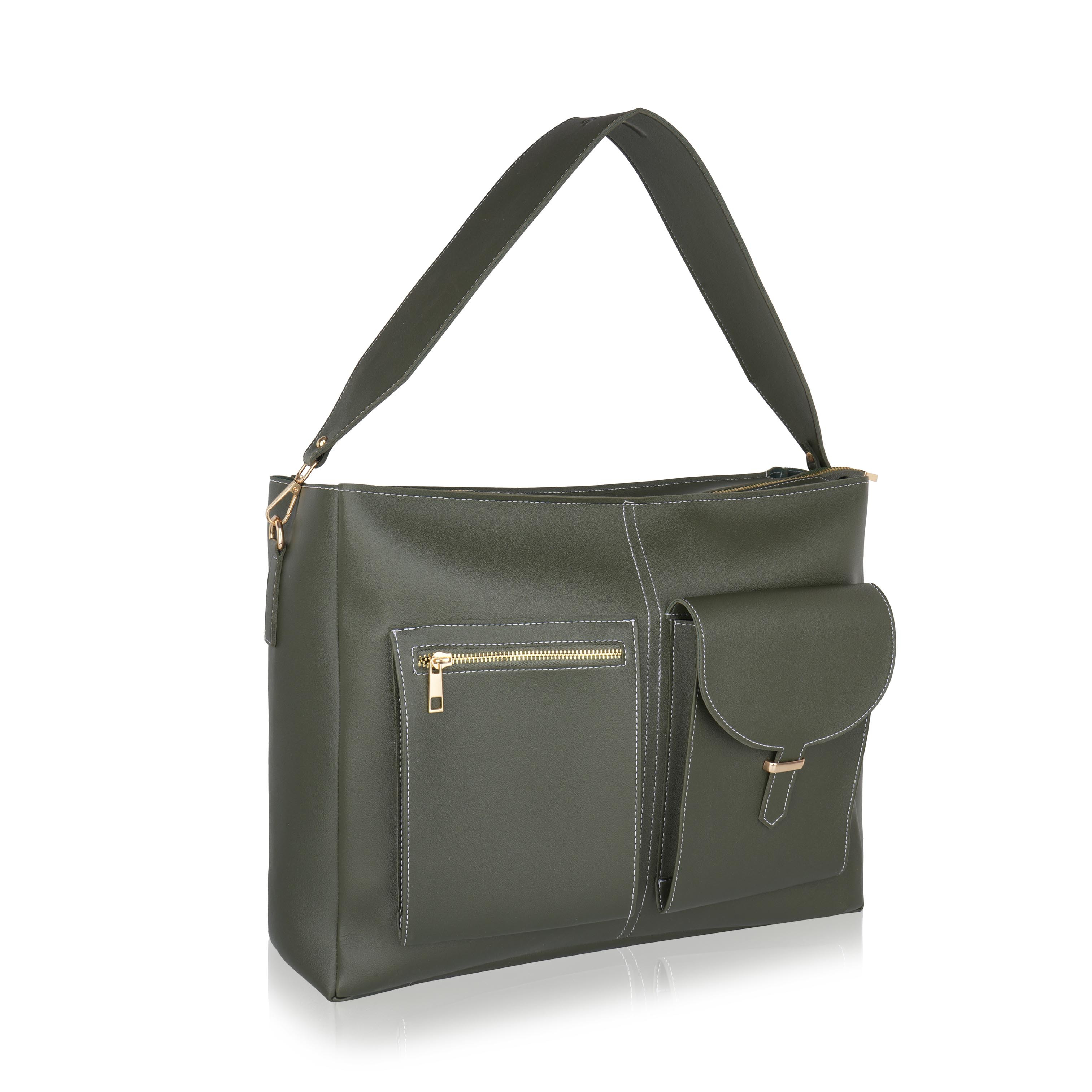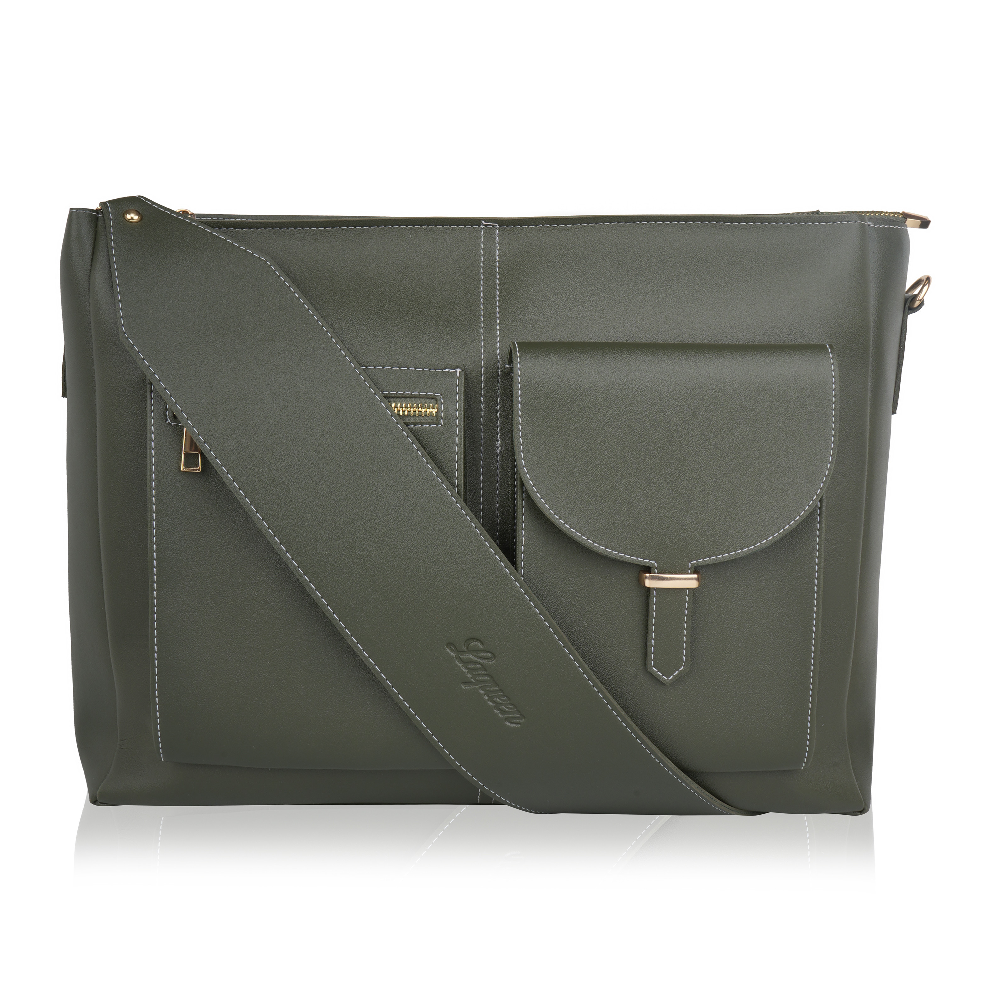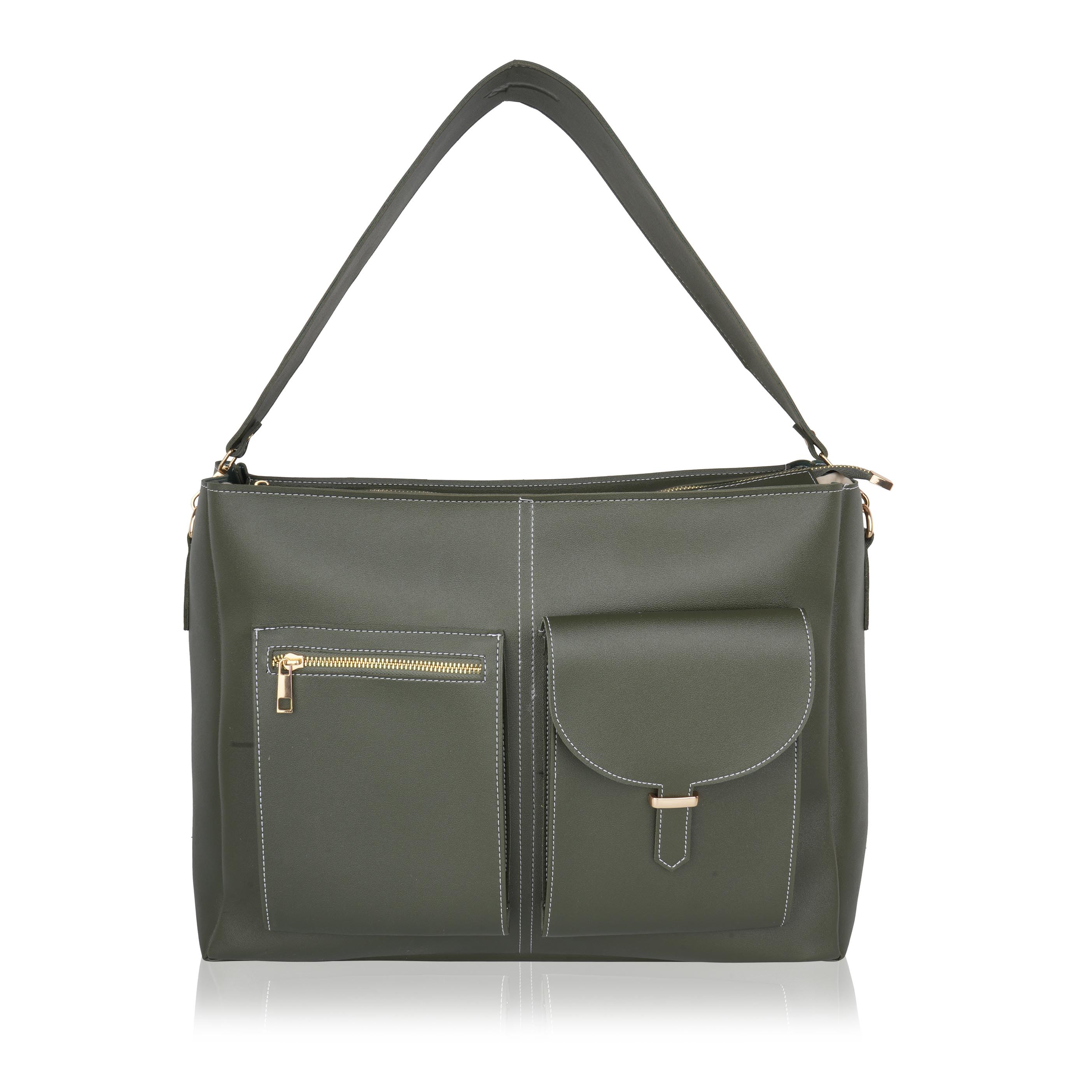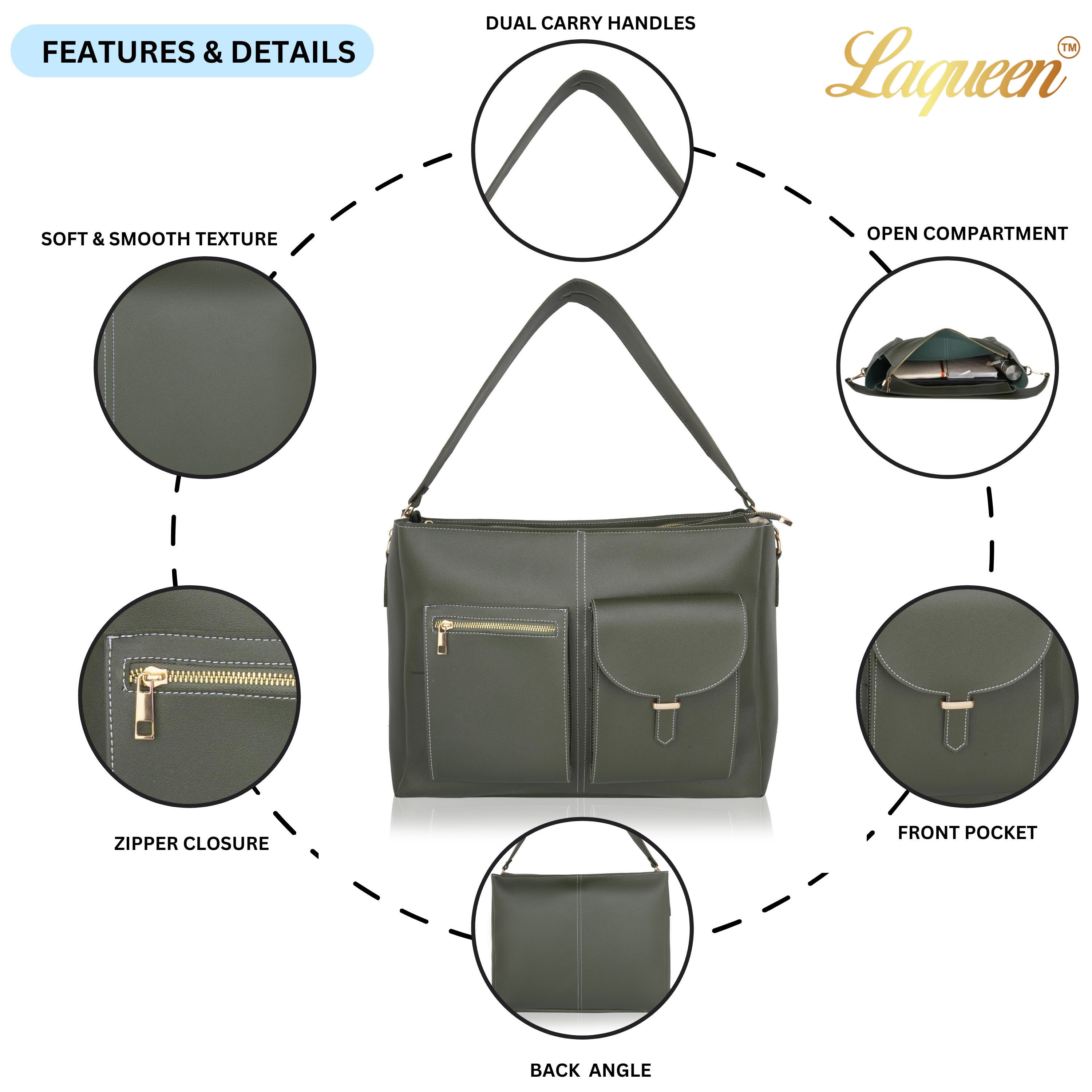 Laqueen Green Women Tote Bag With Front Pockets, Zip Closure And with Detachable Handle Laqueen Tote Bag is sleek and structured tote bag designed for everyday use. Made with a smooth matte finish, it features a secure zip closure and a comfortable shoulder strap for easy carrying. A modern structured tote bag with a front flap pocket and zip closure. Ideal for working ladies, suitable for office, meetings, and daily wear. Crafted for modern working ladies, this tote bag combines a structured look with practical storage, making it perfect for office and everyday use.