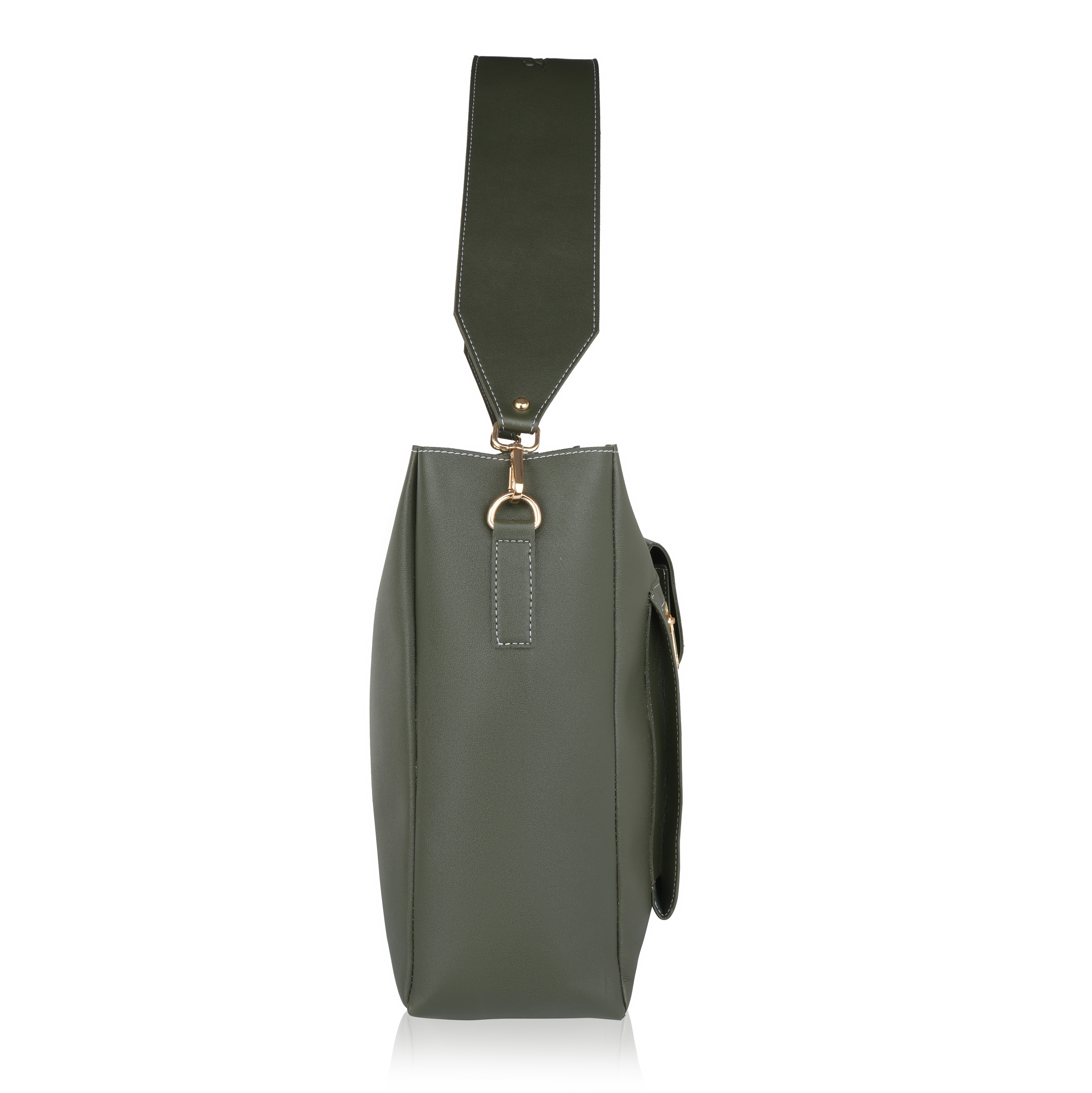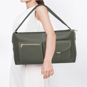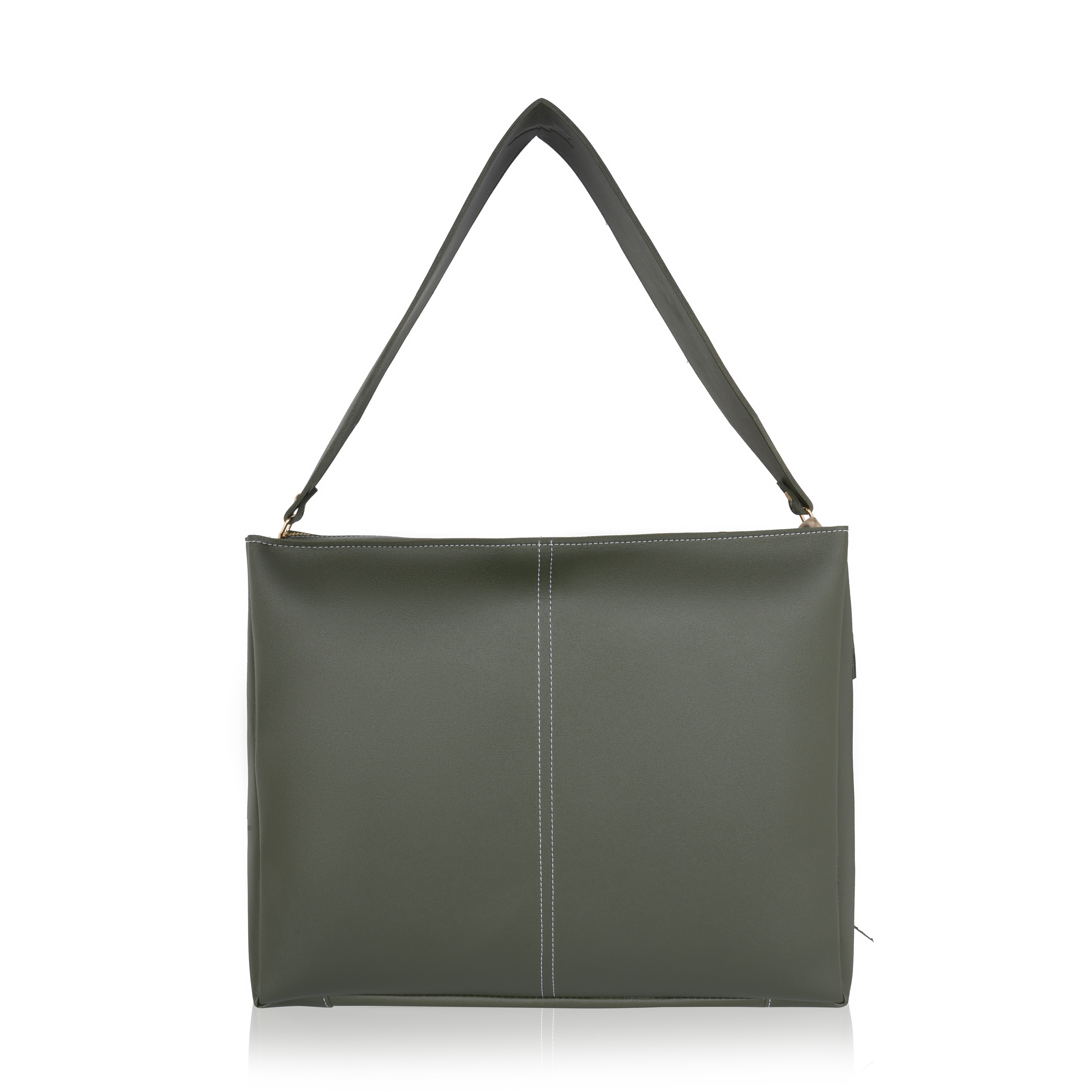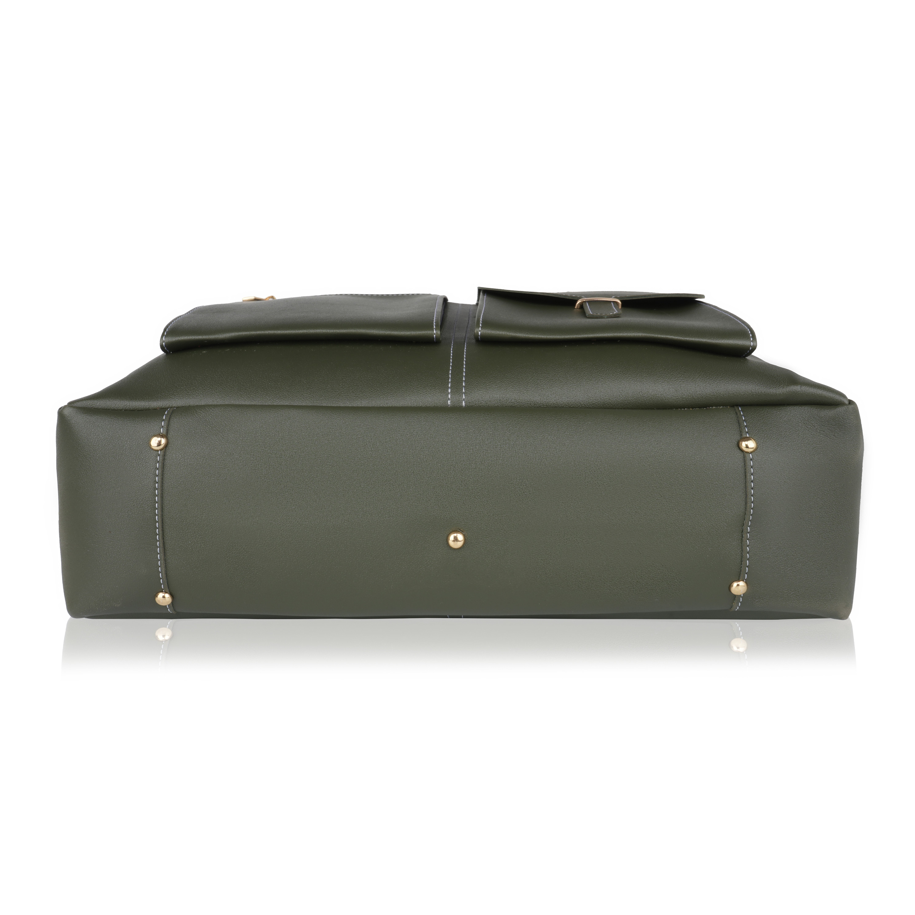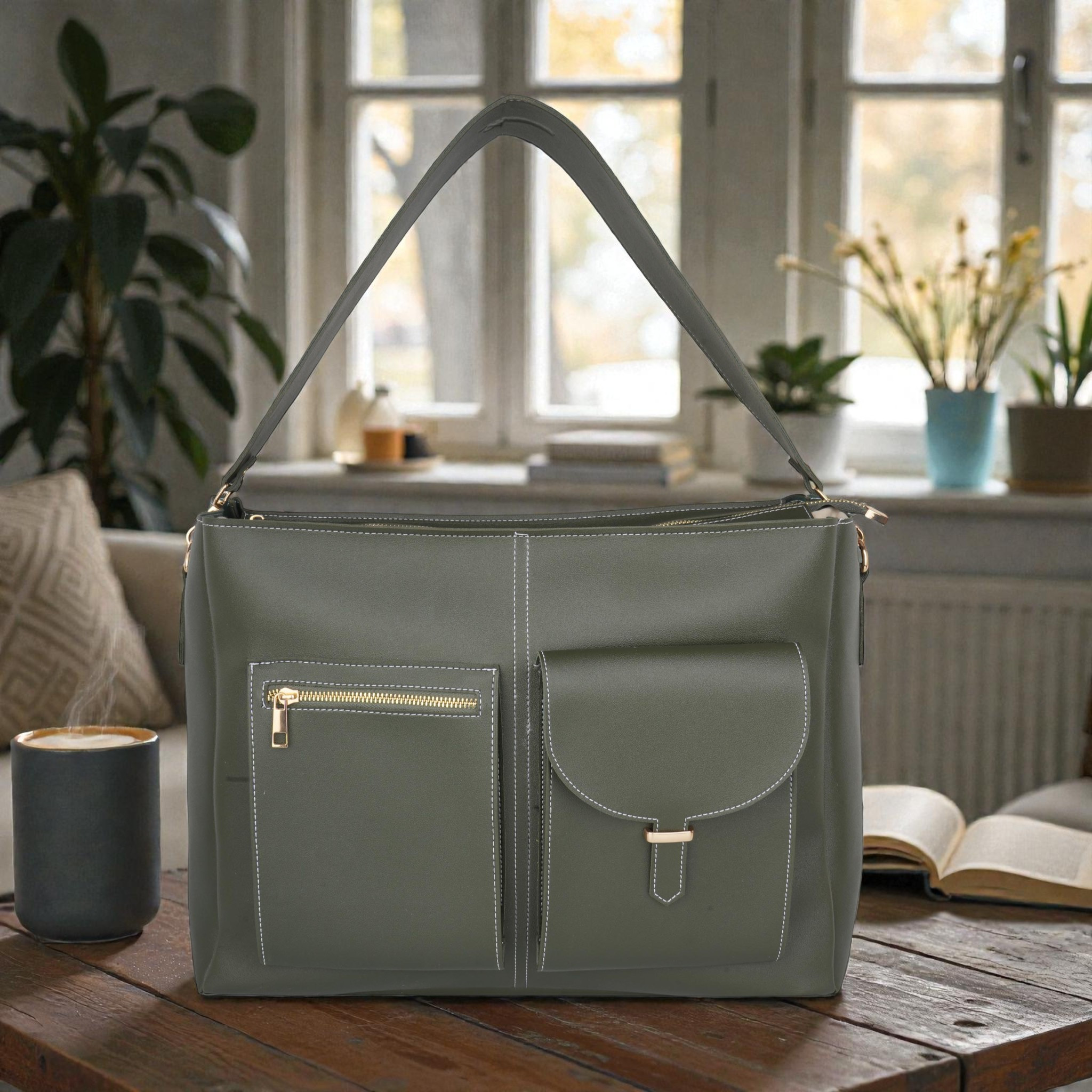 Laqueen Green Women Tote Bag With Front Pockets, Zip Closure And with Detachable Handle Laqueen Tote Bag is sleek and structured tote bag designed for everyday use. Made with a smooth matte finish, it features a secure zip closure and a comfortable shoulder strap for easy carrying. A modern structured tote bag with a front flap pocket and zip closure. Ideal for working ladies, suitable for office, meetings, and daily wear. Crafted for modern working ladies, this tote bag combines a structured look with practical storage, making it perfect for office and everyday use.